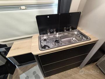 FRIGO A COLONNA (Grande Capacità): A differenza dei classici van con frigo basso, questo modello monta il frigorifero alto ad altezza occhi, per una gestione della spesa da vero camper motorhome.