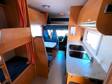 Motorizzazione: Fiat Ducato 2.3 TD 110cv - 6 marce - km: 58800 Disposizione giorno: Dinette 4-6 posti Disposizione notte: Letto matrimoniale mansarda, letto matrimoniale ricavabile dalla dinette, letti a castello. Accessori: Clima cabina, veranda, antenna, pannello solare, telecamera, porta-moto. Posti letto 6 - posti omologati 6 Lunghezza: 6,06mt