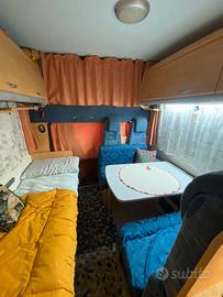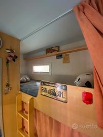 Il camper è configurato con 2 letti a castello longitudinali,ampia dinet con possibilità di letto matrimoniale,ampio divano,con possibilità di altri due posti dinet,tramite tavolo,letto matrimoniale (mansarda) cucina con 3 fuochi frigo trivalente(gas, 220 e 12v).