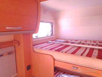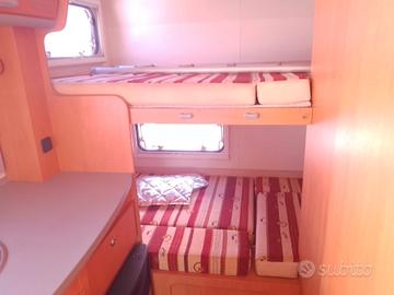 Ottima disposizione con letto a castello in coda, dinette face-to-face, ampio letto in mansarda, cucina longitudinale e ampio garage reversibile.