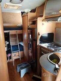 letti a castello posteriori con gavone sottostante ed apertura da entrambi i lati, grande mansarda smidinette con sedili girevoli e divaneto laterale cucina con forno e scaldavivande frigi grande con congelatore separato.