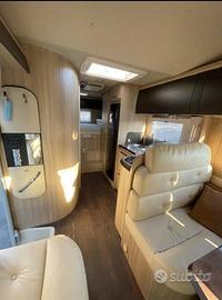 Mansardato con letto matrimoniale in mansarda, dinette a L con divanetto laterale e sedili anteriori girevoli, cucina ad L con colonna frigo 140l freezer separato e forno, bagno con cabina doccia, letto matrimoniale trasversale posteriore basculante per carico moto e bici con ampissimo gavone garage sottostante.