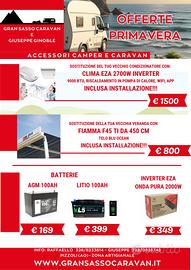Climatizzatore con tecnologia inverter: regolato al minimo ha meno di 4A di assorbimento, ideale per colonnine campeggi anche di bassa potenza! Ma se gli si richiede potenza eroga fino a 2700W in raffrescamento, ideale per mezzi lunghi fino a 8 metri. Grazie alla tecnologia inverter questo climatizzatore ha un funzionamento morbido e continuo senza bruschi avvii o spegnimenti. Anche l'accensione è soft, senza picchi di assorbimento (meno di 1A) Silenziosità di ottimo livello, livello sono compreso tra 43 e 54 dB. Diffusore extra-sottile, dotato di illuminazione a LED e di display LCD, dal design moderno ed elegante. L'EZA 2700 è molto più di una semplice "aria condizionata"! Riscaldamento/raffreddamento reversibile: anche in riscaldamento funziona con pompa di calore, al contrario di molti concorrenti che usano una semplice resistenza elettrica. Modalità Raffreddamento: efficace tra +18°C e +46°C - potenza regolabile con un max di 2700W Modalità Caldo: efficace da -5°C a +24°C - potenza regolabile con un max di 2500W Flusso d'aria regolabile (da225 a 340 m³/h) Possibilità di controllo a distanza tramite app grazie alla connessione WiFi integrata Caratteristiche Tecniche: Tipo : Condizionatore d'aria da tetto Tecnologia : Compressore inverter su Silentbloc Refrigerante : R32, a basso impatto ambientale Reversibile caldo/freddo : Sì, pompa di calore integrata 2700W Potenza termica: rendimento caldo in W 2500 / 8530Btu/h Avvio graduale: nessun picco di corrente Disponibile in sede, spedito in 24H Piccolo sconto per quantità maggiori: contattateci Disponibile sul nostro sito anche il kit di montaggio con sigillanti professionali Disponibile inverter 2000W onda pura per utilizzare il clima in marcia Se ne avrete bisogno siamo disponibile a fornirvi assistenza telefonica e Whatsapp per un corretto montaggio Possibilità di installazione Potete acquistarlo sul nostro shop online www.gransassocaravan.it