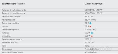 Il Modello CLIMA e-VAN 5400H è stato progettato per un basso consumo e può essere anche collegato a una batteria attraverso un inverter a onda sinusoidale pura di almeno 1500W (Regime) per essere utilizzato con il veicolo in movimento.