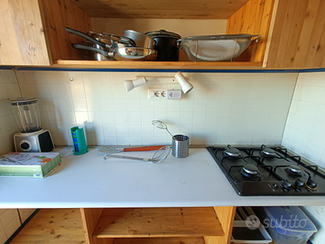 Vendo Cucinino in legno su ruote. All'interno si trova piano cottura a gas, frigorifero, mobiletti e pensili vari, completo di attacco e cavo per la corrente e attacco bombola gas. Guaina su Tetto rifatta da poco.