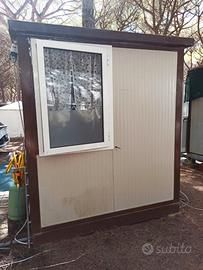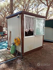 Cucinotto in lamiera 2x2 con porta e finestra in alluminio, vetro temperato, arredato.