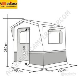 Robusta tenda da cucina ALICANTE REIMO, dimensione in pianta 200x190 cm, con tetto a falde, pali in acciaio Ø19mm, con ampia porta d'ingresso (arrotolabile lateralmente) e tre finestre munite di zanzariera.