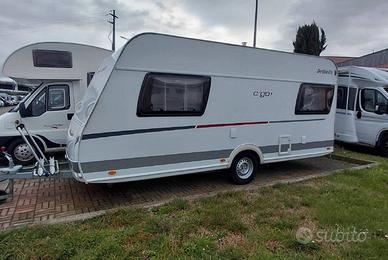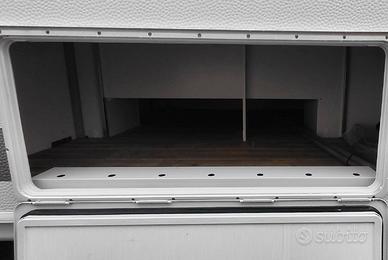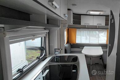 Caravan con dinette trasformabile in letto matrimoniale in coda, bagno e cucina con frigno nella zona centrale, letti singoli gemelli nella parte anteriore.