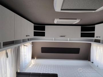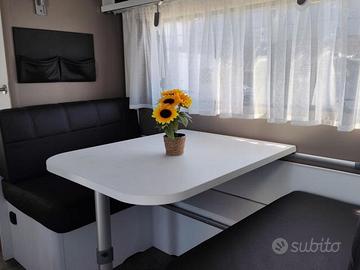 Superfici bianche dalle linee essenziali per un look contemporaneo; contrasti beige che aggiungono calore e accoglienza, letti a castello, con una lunghezza di 210 cm e una larghezza di 75 cm, ampi pensili e i generosi cassetti con sistema Soft close, Il fornello del c'go dispone di 3 fuochi, posizionati in modo tale da permettere l'uso simultaneo di 3 pentole, matrimoniale, dinette centrale trasformabile, climatizzatore, cerchi in lega, tenda Fiamma nuova, roulotte pari al nuovo