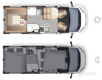 In cabina tutto è pensato per il comfort e la sicurezza: aria condizionata, oscuranti plissettati, digital cockpit e un grande schermo multimediale, con retrocamera integrata.La zona notte è composta da un letto basculante nella zona anteriore e da un ulteriore letto matrimoniale che si ottiene facilmente trasformando la dinette, posta posteriormente. La cucina è ampia e ben studiata, dispone di due fuochi a gas, lavello e frigorifero a compressore da 84 litri, offrendo tutto ciò che serve per preparare pasti anche in viaggio.