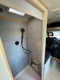 Doccia capiente (75x67 cm), boiler elettrico per acqua calda, WC chimico Potti Deluxe a scomparsa (predisposizione per compost toilet). Sedile di guida girevole per accesso in cabina. Isolamento termico con Armaflex 19mm su tutta la superficie.