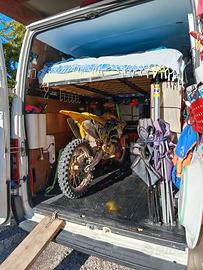 Dotato di comodissimo letto matrimoniale amovibile di 190x140cm con doghe e sotto tutto lo spazio necessario per trasportare e custodire in sicurezza una moto da pista o da cross, oppure le ebike.