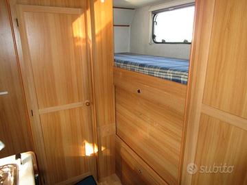7 posti letto e 7 omologati in meno di 7 metri (6,96 m) , con matrimoniale in mansarda, dinette classica trasformabile in matrimoniale, dinette singola trasformabile in divano o letto singolo e letto a castello posteriore, con possibilità di alzare il letto inferiore e realizzare un vano di carico ampio accessibile anche dall'esterno.