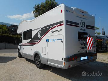 Elnagh Baron 20, camper mansardato 6,99 mt con 8 posti letto (6 posti letto sempre pronti di cui letto matrimoniale in mansarda 160x209 cm c.a e letto a castello MATRIMONIALE posteriore 200x127(110) e 208x128(110) cm c.a. + letto matrimoniale ricavabile dalla dinette 180x121 cm c.a.) e 6 posti viaggio omologati.