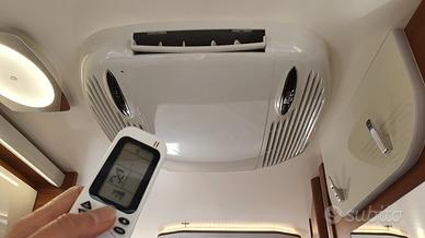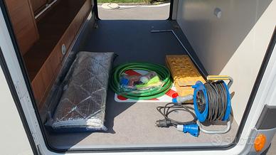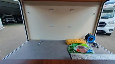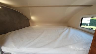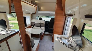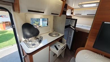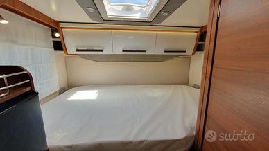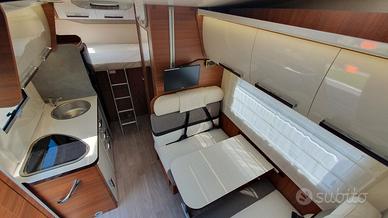 La disposizione interna comprende un letto matrimoniale in mansarda e un letto matrimoniale trasversale, accompagnati da una cucina ben attrezzata con frigorifero trivalente da 145 litri. Il sistema Truma Combi garantisce riscaldamento e acqua calda per il massimo comfort.