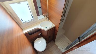 La disposizione interna comprende un letto matrimoniale in mansarda e un letto matrimoniale trasversale, accompagnati da una cucina ben attrezzata con frigorifero trivalente da 145 litri. Il sistema Truma Combi garantisce riscaldamento e acqua calda per il massimo comfort.