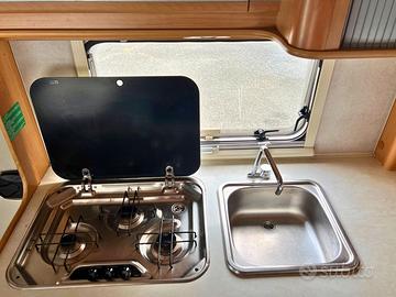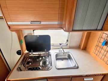 La zona giorno è accogliente efunzionale, con una dinette spaziosa e tavolocentrale, perfetti per condividere pasti e momenti direlax. La cucina attrezzatainclude lavello, fornello a tre fuochi e frigorifero trivalente, mentre il bagno completo offre comfortanche nei lunghi viaggi.