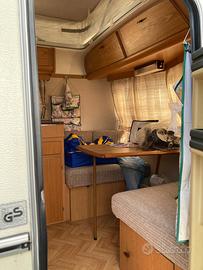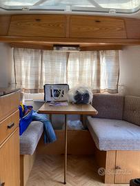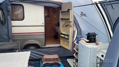 Roulotte del 1991, perfetta in ogni suo particolare, internamente ed esternamente, nonostante i suoi 35 anni. Nessuna infiltrazione, mobilio interno perfetto, cuscini e tende originali e impeccabili. 2 posti letto in coda+1 in testa, frigo trivalente, fornello 2 fuochi, stufa truma a gas, lavandino. Vendo con la veranda in foto, oltre alla sua originale (quadrata e aperta su 3 lati) ed il Porta Potti ThetFord originale (la roulotte non ha il bagno). Dimensioni: lunghezza 4,5mt x larghezza 2mt (non servono le prolunghe degli specchi auto) x altezza 2,20 a tetto abbassato (in stazionamento il tetto si alza di circa 20cm); peso 690kg. Doppio set di ruote (r12 come da omologazione e r13). Tetto in vetroresina. Roulotte con gabbia in acciaio ... costruzioni d'altri tempi. Offro e pretendo massima serietà.
