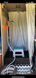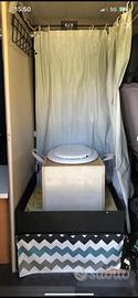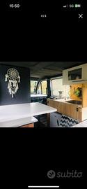 La camperizzazione è composta da un letto matrimoniale fisso in coda con ampio spazio di stivaggio al di sotto, accessibile anche dall'interno e da uno spazioso guardaroba al di sopra. Dinette composta da tavolo, panca con vano interno e ulteriore seduta sfruttando il letto. Cucina con ampio lavello, rubinetto elettrico, fuochi campingaz con vano bombole (CV470 plus, facilmente reperibili in tutta Europa) comodamente accessibile per sostituzione, spazi di stivaggio/dispensa vari e capienti. Al di sotto della cucina sono presenti due taniche da 20 litri di acqua e una da 15 litri per lo scarico facilmente amovibile dall'esterno, vi è inoltre un frigo a compressore alimentato a 220v da 46 litri con piccolo congelatore. Ampio piano d'appoggio ricavato ribaltando i due sedili.
