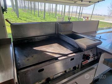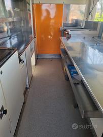 Food truck accessoriato, completo di : frigo vetrina a due scomparti Friggitrice Piastra a gas Firgorifero a colonna Frigorifero per bevande a colonna Piastra in vetro ceramica Affettatrice piccola Due generatori pramac da 3,5 kw Lavabo con serbatoio raccolta acque nere Cunei per stazzionamento Scaletta removibile Impianto stereo Doppia cappa aspirante Cappa per areazione Impianto certificato a Gas Impianto certificato elettrico funzionante con generatori esterni Furgone utilizzabile con patente B Marca furgone Fiat ducato maxi Danni valutati 6.500 €