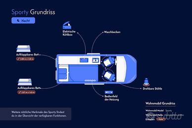 We offer flexible consumer credit options for easy and stress-free purchases! Our Sporty camper is the ideal choice for those seeking the perfect balance of comfort, practicality, and freedom on the road. Whether you're planning an urban getaway or an epic road trip, this camper is ready to take you anywhere! Warranty and money back guarantee 1-year warranty [?] Satisfaction guaranteed! Try it for 14 days, and if you're not satisfied, we'll refund your money! Inspection up to date and ready to hit the road! What makes this camper special? Compact and easy to drive: With a length of only 539 cm, it is easy to maneuver. Reliable and fuel-efficient: 1.6 Mjet diesel engine, 125 hp, manual gearbox and Euro 6 emission class. Comfort for 4 people: With 4 beds and 2 beds, it is perfect for trips with friends or family. Equipped for any adventure: Includes diesel heating, power steering, air conditioning and rear parking sensors. Safe and Secure - Equipped with ABS, ESP, central locking and cruise control for a smooth and safe ride. Test it first - Not sure if it's the right one? No problem! You can rent the camper for as many days as you like to familiarize yourself with it and make sure it's perfect for your travels. Ready to hit the road? The Sporty camper is in high demand! Don't miss out: book a viewing and make it yours today. Contact us now to see our complete stock! Visit our website at https://indiecampers.it/camper-usato/search?country=Italy 53-UU-73