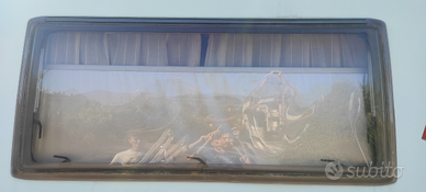 Finestra usata polyplastic a compasso F28 serigrafia grigia F28 1450X600. La finestra non ha alcuna crepa o sbeccatura ma è stata sottoposta ad incollaggio della lastra interna/esterna con appropriato adesivo Acrifix.