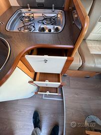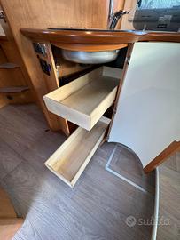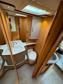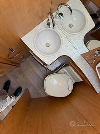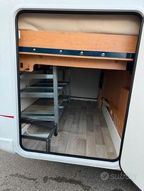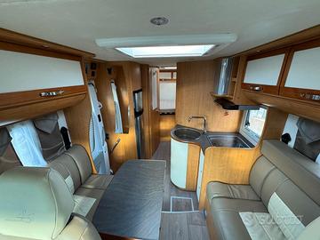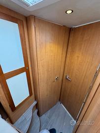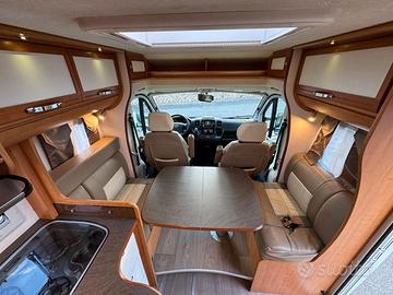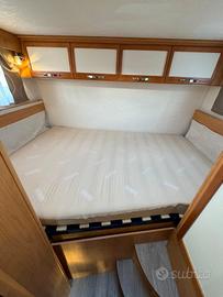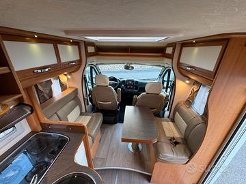 Pianta con letto matrimoniale posteriore trasversale regolabile in altezza elettrico, bagno con doccia separata, angolo cucina, dinette face to face con tavolo centrale, sedili cabina girevoli e grande garage.