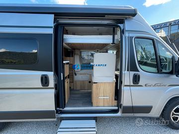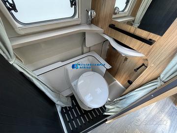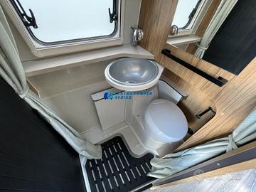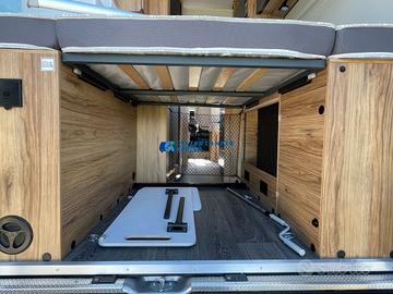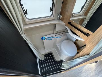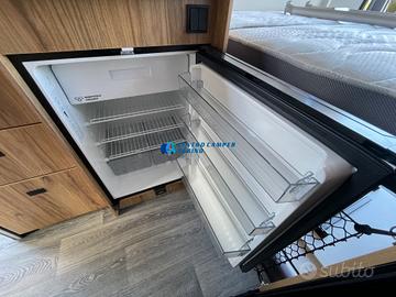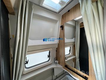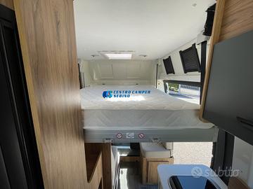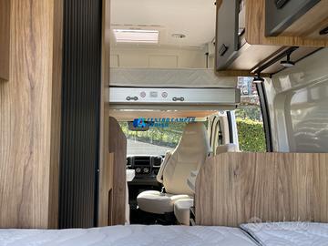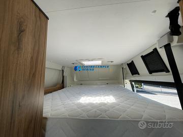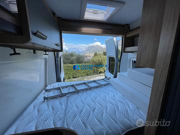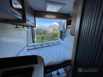 Posti letto 5 di cui 4 posti letto sempre pronti (doppio letto matrimoniale: letto matrimoniale trasversale posteriore 184x130/123 cm c.a. amovibile per aumentare il volume di carico del garage e letto matrimoniale basculante anteriore elettrico 197x132 cm c.a+ letto singolo aggiuntivo in dinette 184x99 cm c.a.)