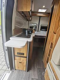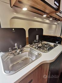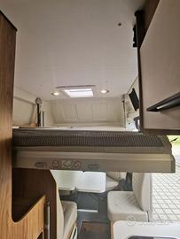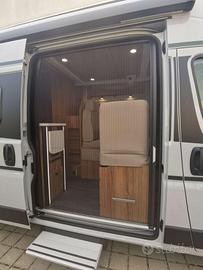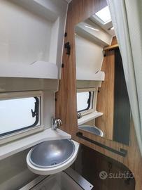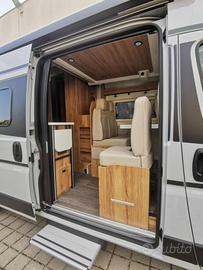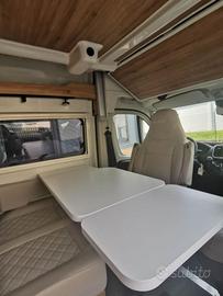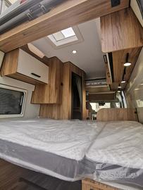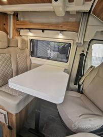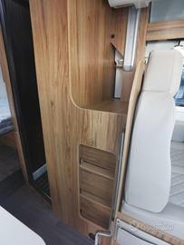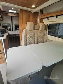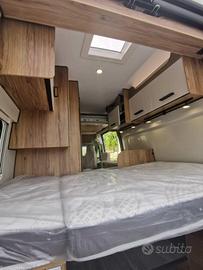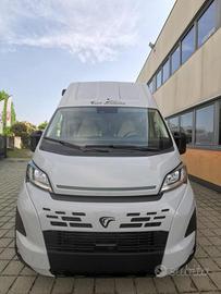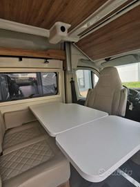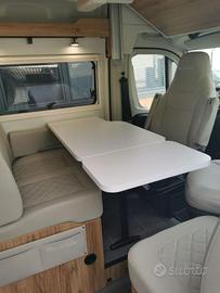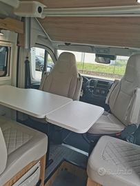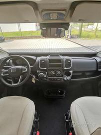 Fiat Ducato 2200cc 140CV EURO 6D, Specchietti regolabili elettricamente, chiusura centralizzata a distanza, predisposizione radio con antenna dab, ABS/ESP,ASR, Hill Holder, traction, hill descent control, Start&Stop, Fix&Go, Airbag guidatore e passeggero, cruise control/limitatore di velocità, climatizzatore manuale in cabina, Leva del cambio in pelle, serbatoio gasolio 90 lt., Paraurti verniciato in tinta carrozzeria, Skid plate nero, Fari fendinebbia adattivi, Isofix nella dinette, Comandi radio al volante, videocamera posteriore, batteria al litio, doccia esterna, tappezzeria in ecopelle, Riscaldamento Truma a gasolio con kit altitudine, pannello comandi CP Plus, finestra posteriore lato sinistro, finestra in bagno, zanzariera scorrevole porta ingresso, oscurante cabina plissettato, vetri posteriori oscurati, luce esterna con funzione di grondaia, serbatoio acque grigie coibentato, fodere sedili anteriori, frigo compressore 110l, pedana piatto doccia, tavolo con prolunga, gradino elettrico