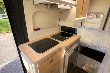 Il Font Vendôme Horizon H 307 è un van dal layout unico, capace di offrire 5 posti omologati e 4 posti letto in soli 5,99 metri. La dinette open space crea un'atmosfera luminosa e accogliente per ospitare fino a 5 persone, con attacchi Isofix e un pratico tavolo con prolunga estraibile, utilizzabile anche all'esterno. La flessibilità degli spazi è garantita dal letto basculante elettrico, sempre pronto all'uso, mentre nella zona posteriore trova posto un letto matrimoniale con doghe in legno, trasformabile per ottenere un ampio vano di carico ideale anche per le biciclette. A completare l'insieme, un armadio capiente e un pensile doppio assicurano un'ottima capacità di stivaggio per ogni viaggio.