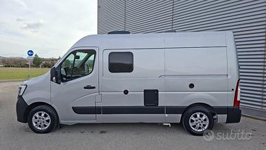 Renault master XS camper furgonato con allestimento Font vendome 4 posti viaggianti. Porte posteriori a battente con tenda interna oscurante con letto matrimoniale dove è possibile togliere solo la parte centrale, barra a led sopra la porta laterale scorrevole, impianto di serie con batteria al litio, bombola gpl per il solo utilizzo dei fornelli, frigorifero a compressore funziona con corrente elettrica 12V, riscaldamento a gasolio Truma Kombi da 4kw che provvede a riscaldare sia l'acqua del lavandino che della doccia, capacità serbatoio acque chiare e grigie 100 litri, bagno con doccia con anche attacco rapido per doccia posizionato sulla parte posteriore sotto il letto, cappelliera porta oggetti sopra la cabina di guida, 3 oblò sul tetto, schermo touch per azionamento servizi interni, tende oscuranti per il parabrezza anteriore e per i finestrini laterali, sedili di guida ruotabili a 360°.