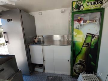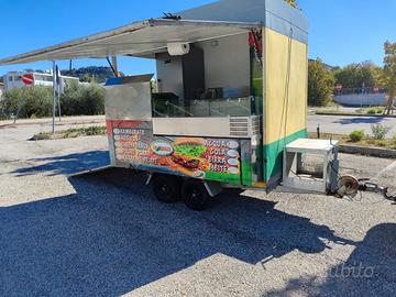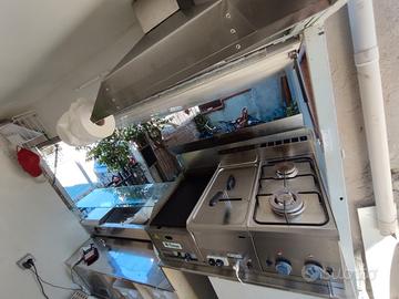 Allestito con fry top, friggitrice, due fuochi, tutto a gas. Bombole. Cappa aspirazione .