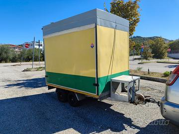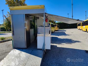 Misure ridotte permettono di parcheggiare e lavorare con posti stretti, lavorabile con 1 persona- molto versatile. 2 persone con flussi grossi. La sponda posteriore ha due piedi e crea una pedana della stessa altezza dell pavimento di totale 1,8×1,6 metri - questa pedana facilmente trasformabile in zona cucina per arrosticini, oppure per posizionare spillatrice birra, noccioline, vendita alimenti ecc. Nello stato chiuso dentro rimorchio entrano 4 panche e 2 tavoli. Tutta attrezzatura ha 1 anno di vita, piani inox nuovi, vetrina 6 mesi, congelatore 6 mesi. Frigo bibite 4 anni - funziona perfettamente! Pavimento antiscivolo.
