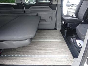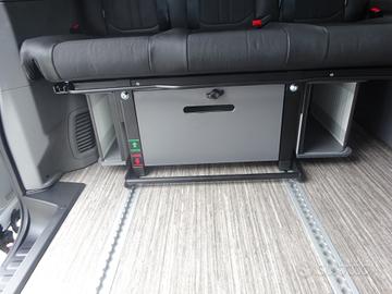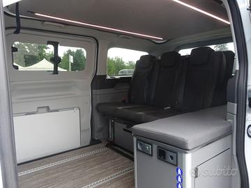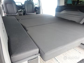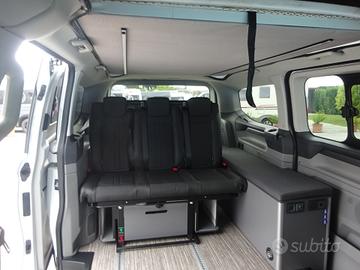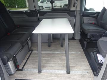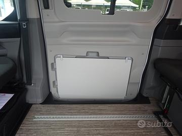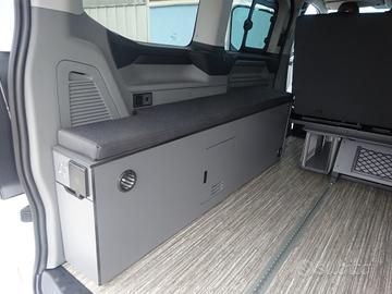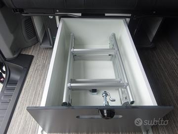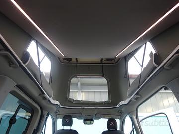 Doppia porta scorrevole, sedili cabina con piastre girevoli, tetto sollevabile che ospita un letto matrimoniale, panca 3 posti scorrevole che si trasforma in un maxi letto matrimoniale grazie al nuovo mobilio laterale con all'interno serbatoio d'acqua per doccetta esterna, piastra induzione e stivaggio.