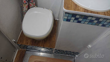 - bagno in coda composto da lavello con doccino, wc nautico e doccia separata, la porta del bagno ha 2 posizioni di chiusura: una chiude solo lavello e wc permettendo l'uso del portellone posteriore attraversando il piano doccia, l'altra posizione separa la zona bagno/doccia dalla zona cucina/dinette.