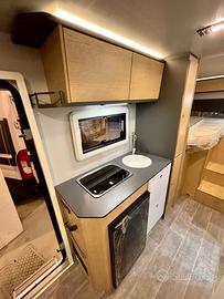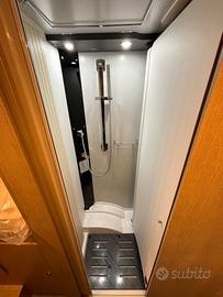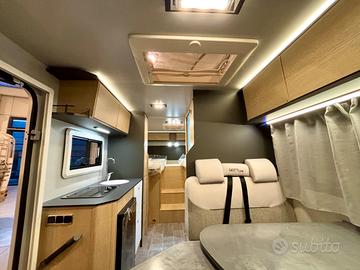 --veicolo compatto, dalla larghezza contenuta, dotato di letti gemelli posteriori e bagno vario, riscaldamento Combi Diesel e serbatoio di recupero coibentato