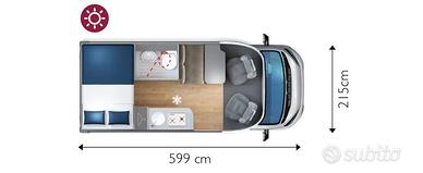 PROMO SENZA PERMUTA DATI TECNICI Anno Produzione: 2025 Numero Posti: 4 Posti Letto: 3 Lunghezza: Larghezza: 215 Altezza: 280 Patente: B Cambio: Manuale Num. Marce: 6 Trazione: Anteriore DOTAZIONI EXTRA: - AIRBAG PASSEGGERO - Eur 0 - CLIMATIZZATORE CABINA (automatico su FORD) - Eur 0 - ESP, TRACTION , HILL HOLDER E HILL DESCENT - Eur 0 - START & STOP - Eur 0 - CRUISE CONTROL - Eur 0 - CERCHI DI 15'' IN ACCIAIO (su Stellantis) - Eur 0 - PREDISPOSIZIONE RADIO CON COMANDI AL VOLANTE - Eur 0 - FENDINEBBIA - Eur 0 - RETROVISORI ESTERNI ELETTRICI - Eur 0 - PARAURTI VERNICIATO IN TINTA - Eur 0 - LUCE ESTERNA A LED - Eur 0 - FINESTRE CON TELAIO A FILO CARROZZERIA - Eur 0 - GRADINO ESTERNO ELETTRICO - Eur 0 - STELLANTIS: Motorizzazione Citroen o Peugeot al posto del Fiat - Eur -1000 - ZANZARIERA PORTA CELLULA - Eur 0 - ATTACCHI ISOFIX (non disponibili con dinette face to face) - Eur 0 - LETTO SINGOLO SUPPLEMENTARE IN DINETTE - Eur 0 - MIDI HEKI 700X500 - Eur 0 - SERBATOIO ACQUE GRIGIE RISCALDATO - Eur 0 - COMANDO TRUMA CP PLUS - Eur 0 - PACK PRIVILEGE COMPACT - Eur 2500 : CERCHI IN LEGA DI 16'' : FODERINE CABINA COORDINATE : PORTA CELLULA XL A 2 PUNTI CON CHIUSURA CENTRALIZZATA : RADIO 6.8" ANDROID AUTO E APPLE CAR PLAY : REAR STYLE CON FARI A LED : RETROCAMERA : SKYVIEW : VOLANTE E POMELLO DEL CAMBIO IN PELLE