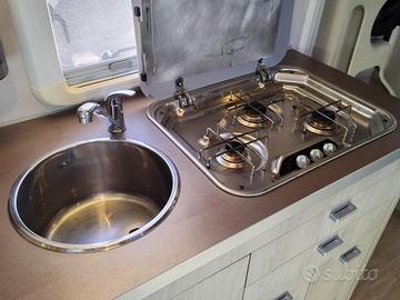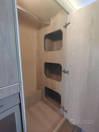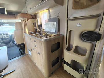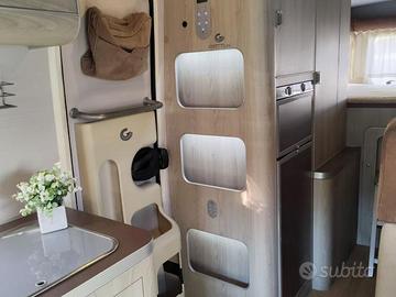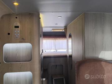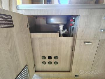 Ampio gavone posteriore porta moto misura 98 cm di larghezza e un'altezza di ben 115 cm, camper ideale anche per le vacanze invernali, essendo dotato di un doppio pavimento tecnico che racchiude tutta l'impiantistica riparandola dal gelo, frigo, piano cottura, amplio garage, sospensioni pneumatiche, vano doppia bombola gas.