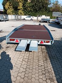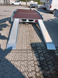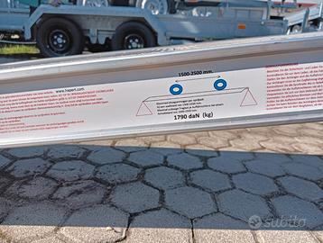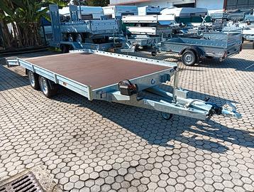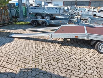 Rimorchio Hapert Indigo HF-2, 2 assi con freni, portata complessiva kg.3490/3400/3000, pianale, parte finale del pianale piegata per favorire il carico di veicoli, miniescavatori, macchinari edili in genere o da giardinaggio, misure utili pianale cm.455 x 200, dotato di coppia di rampe di carico lunghe mt.2,5 rinforzate, portata kg.1790 per ogni rampa, argano e supporto argano, ruote sotto il piano di carico rinforzate da 195/50 r 13 c