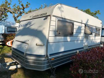 Veranda estiva con paletti completa di chiusure su tutti i lati, lunga come il caravan.