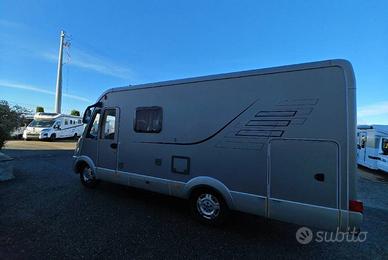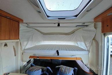 Motorhome con letto matrimoniale nel basculante, semidinette completata dai sedili girevoli in cabina nella zona anteriore, cucina e bagno nella zona centrale e letto matrimoniale trasversale con sottostante gavone garage nella zona posteriore.