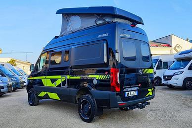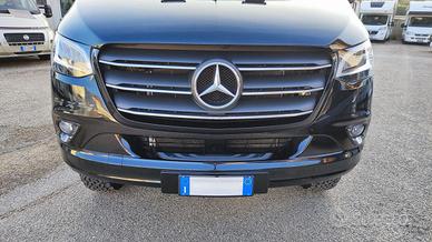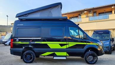Dotazioni di serie: Trazione integrale permanente, Mercedes Benz Sprinter 419 CDI, 190 CV, Euro VI-E, Cambio automatico 9G-Tronic, Active Distance Assist con volante multifunzione, Active Lane Keeping Assist, Blind Spot Assist, Traffic Sign Assist, Sistema assistenza fari abbaglianti, Pacchetto Parking con telecamera a 360°, Fari a LED, Fari fendinebbia, Protezione del motore, Thermotronic climatizzatore automatico cabina guida, Parabrezza riscaldabile, Sistema multimediale MBUX 10,25" con navigatore e retrocamera, Volante in pelle, Seconda cassetta WC con supporto, Cerchi in acciaio da 16" con pneumatici Goodrich All Terrain, Gradino elettrico offroad, Gancio di traino con sfera rimovibile, Paraurti verniciati nel colore del veicolo, 2 sedie e tavolo pieghevole con sistema di ancoraggio, Ambient-Light System, LED lightbar 44" sopra la cabina guida, Adesivo design Crossover.