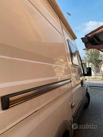 Monta due oblò su tetto più finestra laterale,pannello solare 100w con regolatore di carica e una batteria servizi da ah,monta inoltre un parallelatore di ricarica così quando acceso e batteria motore carica,carica la servizi.