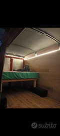L'interno è stato isolato e rivestito con pannelli in spc dove si può continuare la camperizzazione che ora è completamente rimovibile, inoltre è stata appena montata una batteria supplementare da 200 amp alimentata da 2 pannelli solari 200w con pannello di controllo.