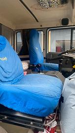 Motorhome con living e trasporto auto 6 posti letto doppia tenda una a rullo e una chiusa modello pista givoni porta gomme bagno riscaldatore gaaolio e a gas acqua calda frigo cucina impianto elettrico a 12 e 220 tagliado e revisione febbraio 2026 veicolo speciale 2 posti viaggio