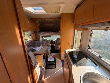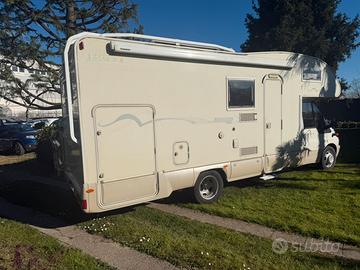 Mansardato Kentucky Estro4 su Ford Transit Gemellato 125 cv anno 2004 6 posti viaggio e 6 posti letto con enorme garage per moto generatore 220v tec29 condizionatore dometic cellula pannello solare solo 59000 km gomme nuove davvero molto bello rimessato sempre al coperto