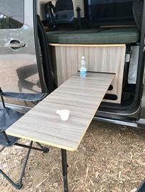 Struttura in legno bilaminato, non assorbe umidità, altezza 50cm, gavone laterale (30/50)x200cm, cassone posteriore scorrevole 80x100cm con ripiani laterali e foro per inserire il rubinetto di una tanica d'acqua. Con la porta scorrevole aperta, la struttura in legno presenta la possibilità di un supporto per l'inserimento di un tavolino di dimensioni 100x45cm.