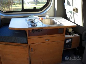 Vendo Kit trasformazione Camper Renault Trafic 2 passo lungo (L2) composto da pianale pavimento, serbatoio acque bianche, serbatoio acque grigie, presa esterna 220V, blocco cucina con lavello+rubinetto, gas 2 fuochi con termocopia, cassetto, n.5 capienti gavoni laterali per bombola gas, pentolame/stoviglie, dispensa, sacchi a pelo/coperte/piumini/guanciali, materiale vario, tavolo con meccanismo di abbassamento, cuscineria blu, tende con binario, WC chimico, portabatteria con carica batteria da 220V, prese 220 e 12V, gruppo fusibili, pompa acqua a pressostato Surflo, attacco per doccetta esterna. Il tutto si monta senza alcuna modifica all'abitacolo originale salvo un piccolo foro nel pianale per passaggio scarico acque grigie.