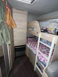 Letto matrimoniale anteriore trasversale - Letti a castello posteriori longitudinali - Dinette trasformabile in letto matrimoniale con Cucina lineare 3 fuochi e Frigorifero trivalente 140 lt