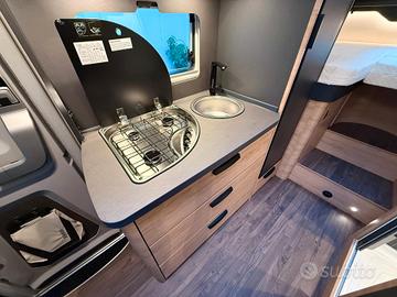 KNAUS L!VE I 650 MEG (2026) Veicolo: Telaio FIAT Potenza 103 kW / 140 PS Trasmissione manuale Posti Letto 5 Posti Omologati 5 Dati tecnici Dimensioni: Lunghezza complessiva (cm) 697 Larghezza esterna/interna (cm) 232 / 218 Altezza esterna/interna (cm) 279 / 200 Misure letto nella parte anteriore (cm) 205 x 118/40 Misure letto basculante (cm) 193 x 150 Misure letto nella parte posteriore (cm) 202 x 78; 197 x 78 Peso: Massa a pieno carico tec. ammissibile (kg) 3.500 Massa in ordine di marcia (kg) 3.005 (2.855 - 3.156) Massa residua dell'equipaggiamento opzionale (kg) 36 Dotazione di serie FIAT Ducato 3.500 kg *** (103 kW/140 CV); trazione anteriore; Euro 6e-bis PACK STYLING LIVE I: Cerchi in lega da 16'', Griglia e cornice del radiatore con applicazioni cromate di altra qualità, Pregiate serigrafie con elementi in ottica di carbonio, Finestrino lato guida con telaio color nero, sideblade sotto i finestrini con delle applicazioni cromate Dotazione opzionale Oscurante plissettato del parabrezza, funzionamento manuale (allungabile sia dall'alto che dal basso) 534,00 € Serbatoio carburante da 90 litri 104,00 € Finestra panoramica sul tetto 130 x 45 cm con oscurante e zanzariera (posteriore) 686,00 € Prolunga del letto per trasformazione in letto matrimoniale 579,00 €